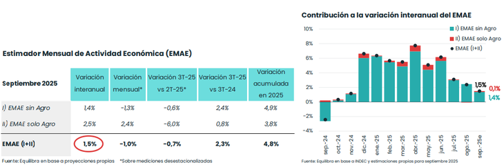 La consultora Equilibra calculó una contracción mensual del 1% en su propio Estimador Mensual de Actividad Económica (EMAE) de septiembre. Esto fue explicado por un retroceso del 1,3% en el indicador que excluye al sector agropecuario, ya que este último tuvo una mejora del 2,4%.