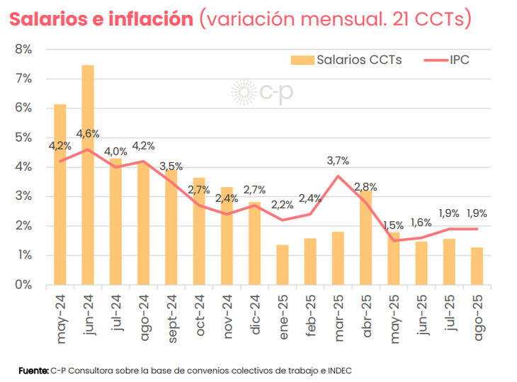 Como el ancla salarial es una de las variables que utiliza el Gobierno para contener la inflación -junto con el control del tipo de cambio-, en el relevamiento mensual de 21 convenios colectivos de trabajo (CCT) que realiza CP-Consultores se observa que, en casi todos los meses de 2025, las paritarias quedaron por debajo de la inflación.