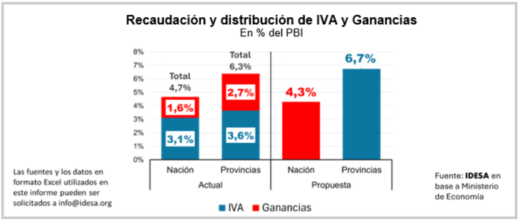 Según plantea la hipótesis de IDESA, la recaudación del IVA nacional equivale casi al 56% que se llevan actualmente las gobernaciones a través de proporciones de diferentes impuestos, principalmente Ganancias.