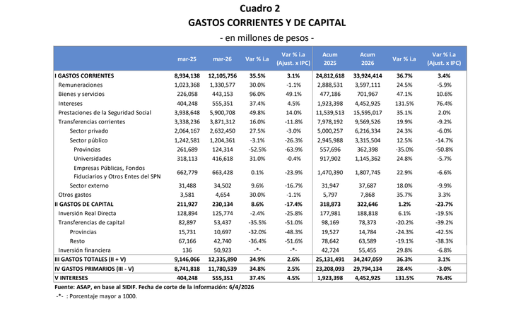 La contracción se vio fuerte en tres de los principales rubros del gasto: remuneraciones (-5,9%), transferencias corrientes (-9,2%) y Gastos de Capital (-23,7%). El ajuste empieza a afectar el normal funcionamiento de áreas sensibles, como es el caso del transporte. La reducción de frecuencias en los colectivos del Área Metropolitana de Buenos Aires es un problema aún no resuelto.