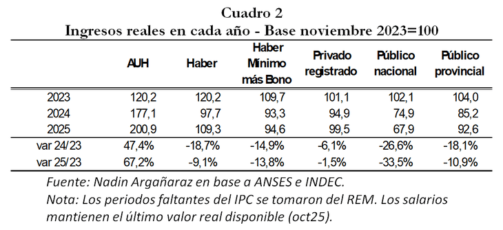 "De cara hacia 2026, no son esperables cambios significativos en las tendencias del poder adquisitivo de los seis grupos de receptores dependientes de ingresos formales. Con el descenso de la inflación habrá una leve suba real de los haberes jubilatorios que, dado el bono de $70.000, no compensará la pérdida real de los ingresos de los jubilados que cobran el haber mínimo", aseguró el economista, al mismo tiempo que prevé una mejora en la AUH por la desaceleración de los precios.