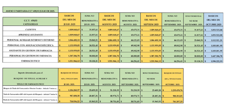 La Federación Argentina de Trabajadores de Farmacia (FATFA) cerró un acuerdo paritario con vigencia hasta octubre de 2025, que establece aumentos salariales mensuales para julio, agosto y septiembre, sumas no remunerativas y un bono adicional trimestral, que se cobrará en septiembre.