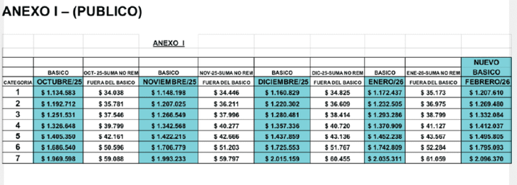 Estas sumas adicionales —que varían según categoría, desde unos $326 a más de $76.000 según el puesto— representan una actualización promedio cercana al 6% mensual sobre los valores básicos actuales. Además, las sumas no remunerativas deberán computarse para el cálculo de aguinaldo, vacaciones y horas extras, aunque no forman parte de los aportes previsionales hasta su pase al básico en 2026.