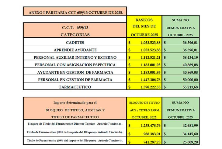 De acuerdo al CCT 659/13, los básicos del mes de octubre se actualizan a $1.053.523,88. Esto representa un aumento del 4,3% en un mes y otro. A diferencia de los meses anteriores, no habrá un bono no remunerativo. De todas formas, este básico es representativo para un cadete y un aprendiz ayudante, mientras que un farmaceútico cobrará de básico este mes $1.598.222,53.