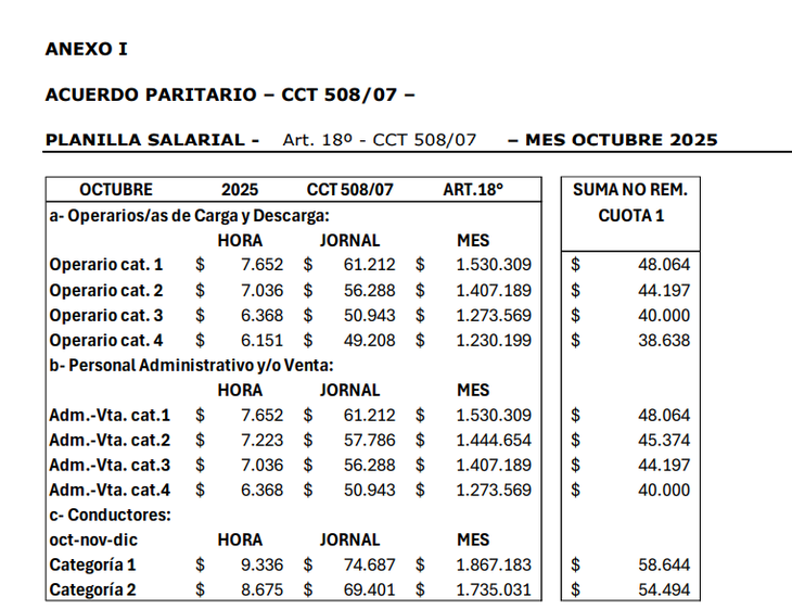 Este mes, los trabajadores de carga y descarga tendrán un incremento y una suma no remunerativa. Lo mismo aplica para el mes que viene. Esta suma, dependerá de cada categoría. La planilla a continuación.