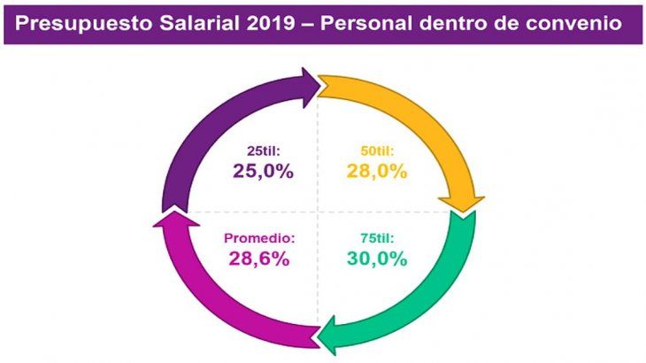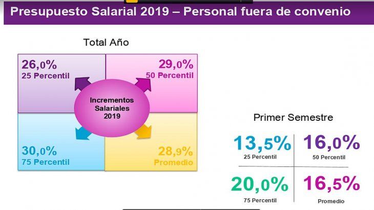 Según un reciente informe de Willis Towers Watson, las empresas calcularon otorgar incrementos salariales que van entre el 25% y el 30% tanto para trabajadores fuera y dentro de convenio. Los más beneficiados serían los de las industrias petrolera, comunicación/entretenimiento, y alta tecnología, seguidos por servicios y automotriz. En la otra punta están las entidades financieras, los retails, y los químicos. En todos los casos, los aumentos serían más fuertes en la primera mitad del año, y se prevén entre dos y tres ajustes con mayor preponderancia en los meses de abril y octubre.