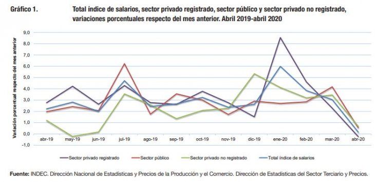 De acuerdo a lo comunicado por el INDEC este martes, los salarios crecieron apenas un 0,2% en abril, el primer mes completo con cuarentena para prevenir los contagios de Covid-19. Sin embargo, en los primeros cuatro meses de 2020, el aumento fue del 13,6% y se ubicó por encima de la inflación del período, que alcanzó el 9,4%.
