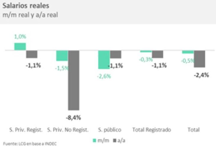 Según un reciente informe de la consultora LCG, por tercer mes consecutivo los trabajadores experimentaron una pérdida de su poder adquisitivo. Se destaca la pérdida que presentó el sector público (-2,6% m/m real). En esa línea, "continúa agrandándose la brecha de ingresos con el sector privado no registrado, que nuevamente tuvo un descenso en su salario del 1,5% m/m real.