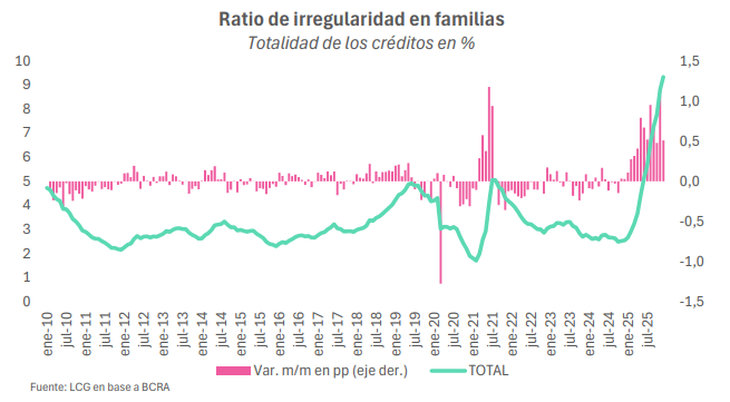 Sobre la morosidad, Equilibra expuso que el incumplimiento de las familias alcanzó en diciembre de 2025 un nuevo récord (9,3%) explicado por máximos en tarjetas de crédito (9,3%), préstamos personales (12%) y garantías prendarias (5,8%).