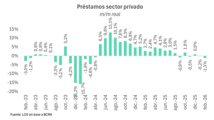 Según un cálculo de la consultora LCG, en base a datos del Banco Central (BCRA), los préstamos en moneda local cayeron 1,3% mensual, su variación más negativa desde marzo de 2024. Se trató de la segunda contracción al hilo y la cuarta desde septiembre del año pasado.