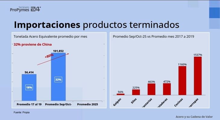 La discusión sigue pasando por el contexto: el avance de China y la guerra comercial que obliga al gigante asiático a redireccionar sus excedentes. Martín Berardi, presidente Ejecutivo de Ternium, mostró algunos datos: el crecimiento de las exportaciones y una concentración del 35% de las manufacturas del mundo y la creciente inversión en el sector manufacturero por sobre la infraestructura y los activos fijos. Mientras tanto Argentina se abre y las importaciones de acero se incrementaron alrededor de un 80%.