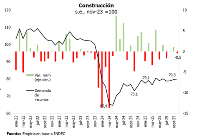 La construcción enfrenta un 2026 “desafiante”, según el último informe de la consultora Empiria. En octubre la actividad cayó 0,5% sin estacionalidad y creció 8% contra octubre del año pasado. A pesar de que en el acumulado del año la construcción creció 7,9%, todavía sigue 20,7% por debajo de los niveles de noviembre de 2023.
