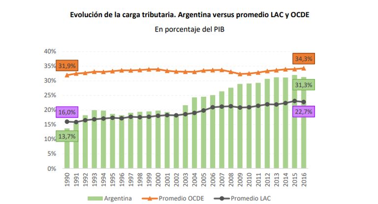 Si bien se encuentra aún por debajo de la presión tributaria del promedio de los países de la OCDE (34,3%), es sustancialmente más elevada que el promedio de Latinoamérica y el Caribe (22,7%), según el IARAF, la carga tributaria de Argentina.