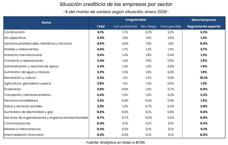 Mientras en familias la morosidad en los créditos saltó del 2,5% al 10,6% entre octubre de 2024 y enero de 2026, en empresas avanzó del 0,7% al 2,8% en un período similar.