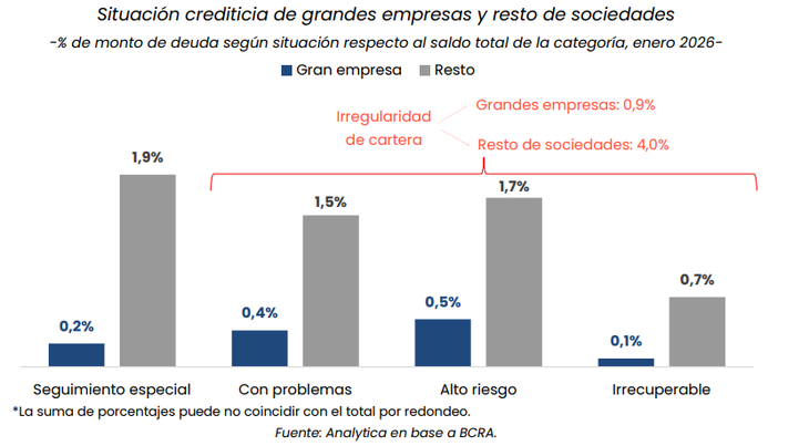 Un informe de la consultora Analytica subrayó que en estas últimas el porcentaje no es tan elevado fundamentalmente porque el grueso del saldo de financiamiento lo concentran “las sociedades jurídicas que se encuentran listadas como grandes empresas (que representan apenas el 0,3% del total), que cuentan con más herramientas para gestionar las necesidades de caja y tienen acceso a mayor y mejor financiamiento”.
