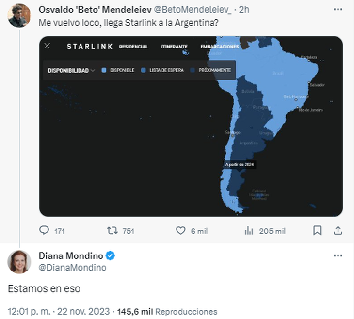 "Estamos en eso", respondió confirmando la posibilidad de que la empresa llegue al país. Starlink ya tenía aprobado por el Ente Nacional de Comunicaciones (Enacom), desde 2021, los permisos para operar. A principios de ese año, la entidad autorizó a la empresa como proveedora, según lo estableció la resolución 1291/2020 que se publicó en el Boletín Oficial en diciembre de 2020.