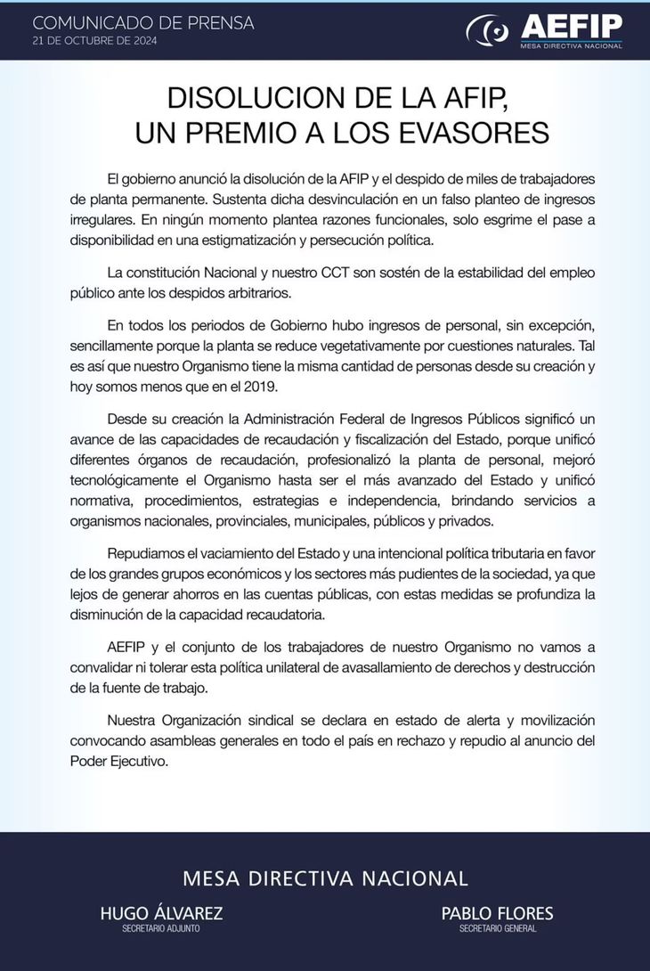 “El gobierno anunció la disolución de la AFIP y el despido de miles de trabajadores de planta permanente. Sustenta dicha desvinculación en un falso planteo de ingresos irregulares. En ningún momento plantea razones funcionales, solo esgrime el pase a disponibilidad en una estigmatización y persecución política”, explica parte del comunicado difundido por AEFIP.