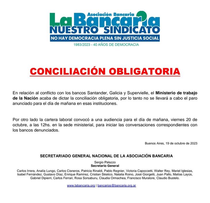 Así lo confirmó la Asociación Bancaria, a través de un comunicado, en el que se destacó que el viernes al mediodía habrá una audiencia en la sede de la cartera Laboral "para iniciar las conversaciones correspondientes con los bancos denunciados".