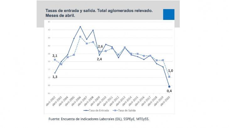 La tasa de entrada de 0,4% (que mide justamente el nivel de las contrataciones) alcanzó el valor más bajo desde, al menos, septiembre de 2001, cuando se inicia la serie de la EIL. Y la tasa de salida fue de 1%.