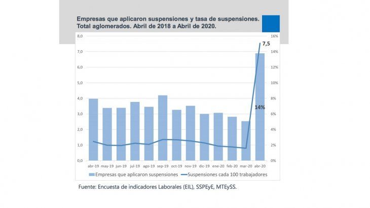 A nivel de empresa también se registró un valor muy acrecentado: el 14% las firmas aplicaron suspensiones, más que duplicando los valores históricos. Recordemos que rige el acuerdo de la UIA con la CGT –y que se trasladó a múltiples gremios- de suspensiones con recorte salarial del 25% a cambio de evitar despidos.