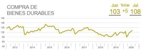 La evaluación de la compra de bienes durables mantiene una tendencia positiva y gana 5 puntos en julio. "Estimamos que esto fue apalancado por incentivos al consumo: cuotas y descuentos, principalmente en rubros que habían estado cerrados en los últimos meses, además muy probablemente también influyó el HotSale 2020, que presentó aún más propuestas y oportunidades", se destacó en el informe.