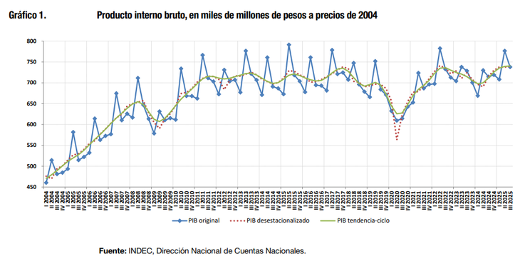 El Producto Bruto Interno (PBI) tuvo una leve mejora en el tercer trimestre de 2025, respecto del trimestre previo, por lo cual el INDEC confirmó que la economía argentina logró evitar la recesión. Esto había sido adelantado por los datos del Estimador Mensual de Actividad Económica (EMAE) del propio organismo oficial de estadísticas públicas.