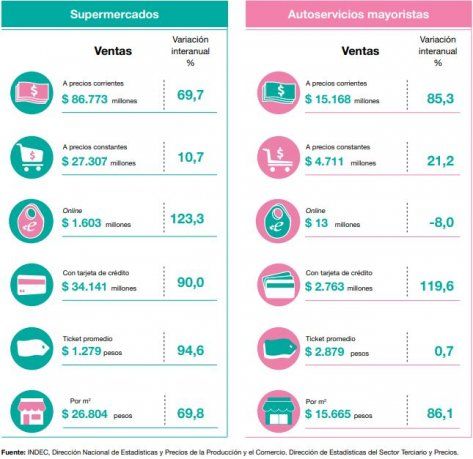 Por su parte, en los supermercados la venta total alcanzó los $86.773 millones, un monto 69,7% superior al del mismo período del año anterior, si se mide el cambio a precios corrientes.