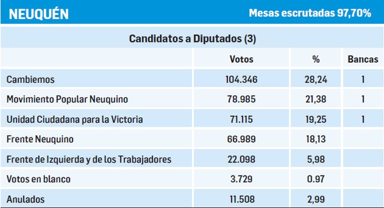 Con estos resultados las tres bancas que se renuevan en la Cámara de Diputados de la Nación, serán ocupadas por David Scheleret de Cambiemos, y Alma Sapag del MPN, y Ramón Rioseco del Frente Neuquino.