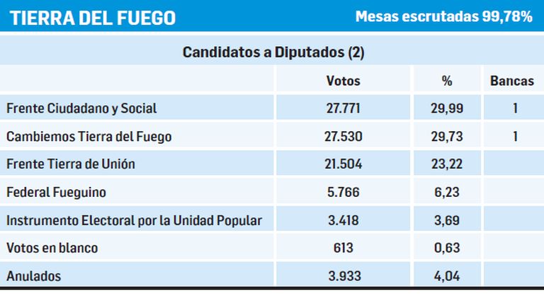 Cambiemos se benefició por doble vía: la ruptura peronista que los llevó a presentar dos listas (la K y la de Bertone) y la declinación de las candidaturas de Tierra de Unión, del radical Federico Sciurano, exintendente de Ushuaia y cuarto en las PASO. Esos votos fueron absorbidos en mayor medida por sus excompañeros de la UCR alistados en Cambiemos. La disputa que mantiene Bertone con los intendentes kirchneristas de Ushuaia (Walter Vuoto) y Río Grande (Gustavo Melella) por su dialoguismo con la Casa Rosada dejó a la gobernadora debilitada para los próximos dos años de gestión.