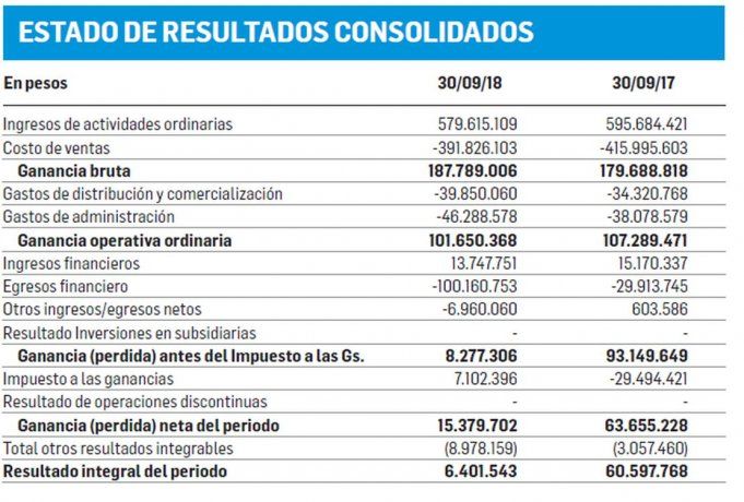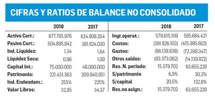 A pesar de esto, y al costo de un uso de la capacidad instalada muy bajo, supo controlar los inventarios (que arrancaron el año por encima de la media, frente a perspectivas que terminaron abortadas por la realidad), que retrocedieron 8% en doce meses a $191 millones.Entrando en el contable, la vemos con ventas por $580 millones (3% menos que antes) que descontados costos le dejan un bruto de $188 millones (5% más). Si bien controla los gastos (+19% frente a una inflación de 40.5%), el operativo de $102 millones es 5% menor al de 2017. En lo financiero resigna $93 millones ($14 millones antes) que con el reconocimiento del fisco le significa un neto de $15.379.702, cuando sumaba $64 millones doce meses antes.