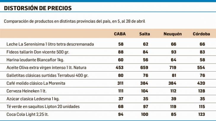 La excepción que confirma la regla es la bebida Coca Cola Ligth de 2.25 litros. Mientras el precio promedio en la Capital Federal es de $95, en Córdoba cuesta $123 y en Neuquén $85, ubicándose como el valor más económico relevado por este diario.