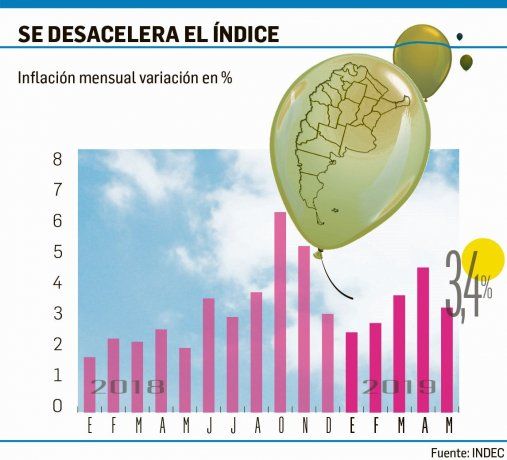 Tras el mal sabor que dejó el mes pasado la elevada inflación de marzo (4,7%) el Índice de Precios al Consumidor (IPC) registró cierta desaceleración en abril, al ubicarse en 3,4%, informó ayer el INDEC. El índice disminuyó en 1,3 puntos porcentuales con respecto a la variación de marzo, pero continúa en niveles elevados, ya que en el primer cuatrimestre acumula un incremento del 15,6%. Con este resultado, el IPC ya cubrió el 68% de la meta del 23% que se había proyectado en el Presupuesto de 2019. En la comparación interanual, la inflación alcanzó el 55,8%, la mayor cifra desde el fin de la hiperinflación en 1991.