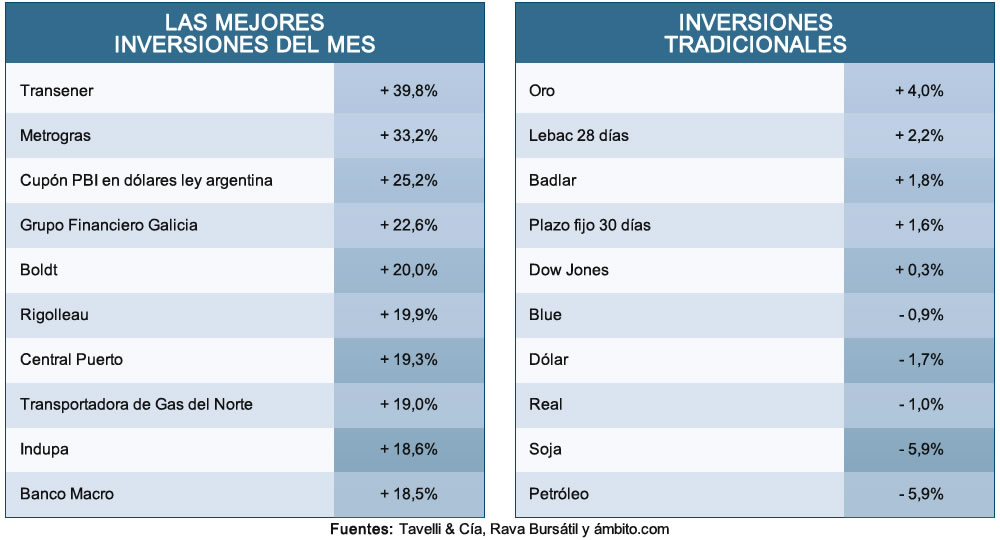 Fue como resultado del anuncio del Estimador Mensual de Actividad Económica (EMAE) de junio, que creció 4% interanual, según informó el Instituto Nacional de Estadísticas y Censos (INDEC). Por otra parte, entre las monedas, el dólar mayorista cerró el mes con una baja de 1,8%, mientras que el minorista descendió un 1,7%. En tanto, el "blue" cayó un 0,9%. A su vez, el euro finalizó con una caída del 0,7% en el mercado local, y terminó en $21,80. Mientras que, en términos de rendimientos, los commodities arrojaron mayormente datos adversos: el petróleo cayó un 5,9% a u$s47,23, los granos se desplomaron hasta un 13,5% y el oro trepó un 4% a u$s1318,50.
