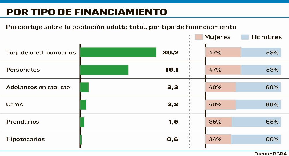 A nivel nacional, 44% de las mujeres adultas tiene algún tipo de financiamiento en el sistema mientras que en el caso de los hombres adultos ese porcentaje asciende a 52%.