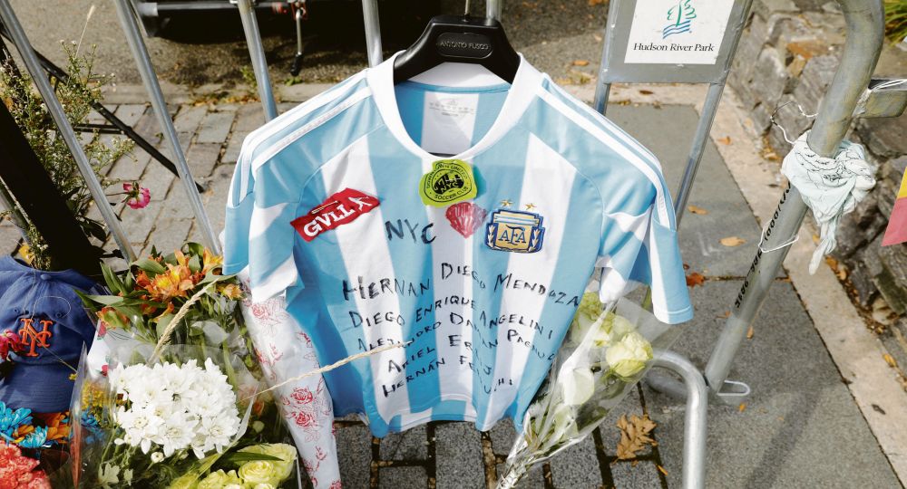 MEMORIAL. Los ciudadanos levantaron un homenaje improvisado donde ocurrió la masacre. Entre los objetos se destacaban banderas y camisetas argentinas.