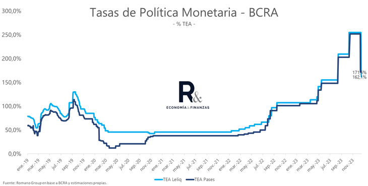 Desde Romano Group aseguraron que "el Banco Central decidió bajar la tasa de política monetaria al 100% de TNA. Esto es una TEA de 162,1%, lo cual deja la TEA de pases pasivos por encima de las Leliqs, algo inusual en la historia reciente".