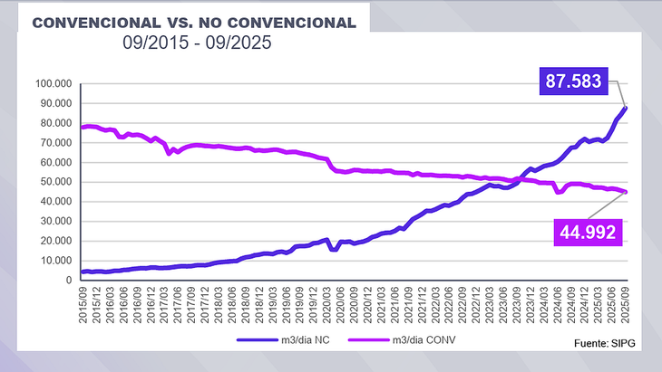 Actualmente, el shale de Vaca Muerta represtan un 66% del total, mientras que el convencional aporta 34%. Pero en septiembre del 2020 la proporción era 25-75 a favor de las cuencas maduras.