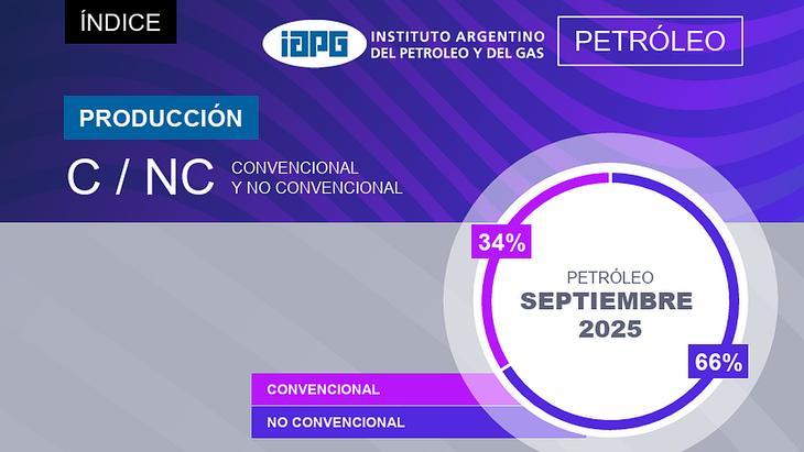Según el último reporte estadístico del IAPG de septiembre pasado, la producción total de petróleo del país acumuló ese mes 132.575 metros cúbicos (unos 833.807 barriles de petróleo diarios), de los cuales 87.583 m3 son no convencional y 44.992 m3 son convencionales.