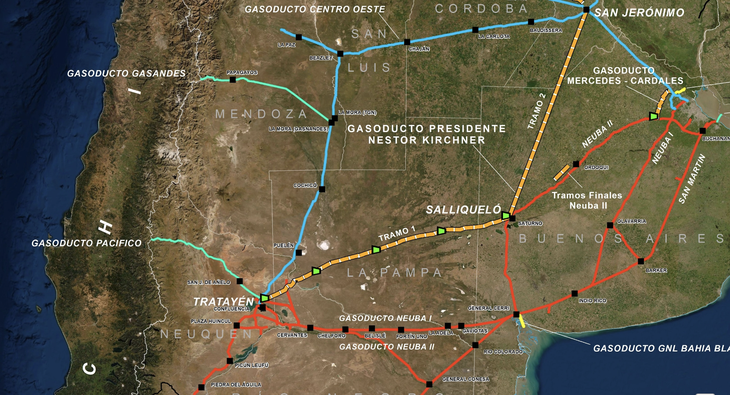 - La traza troncal del Tramo I tiene una extensión de 573 kilómetros entre Tratayén (Neuquén) y Salliqueló (Buenos Aires)
