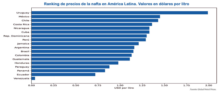 De hecho, según otro ranking que elabora SEG Ingeniería, a partir de los datos de Global Petrol, Uruguay quedó en primer lugar en la comparación del valor de la nafta con los demás mercados de la región al inicio de 2026: el litro del otro lado del Río de la Plata se consigue a 1,998 dólares, muy por encima del segundo puesto mexicano, con un precio de 1,427 dólares por litro.
