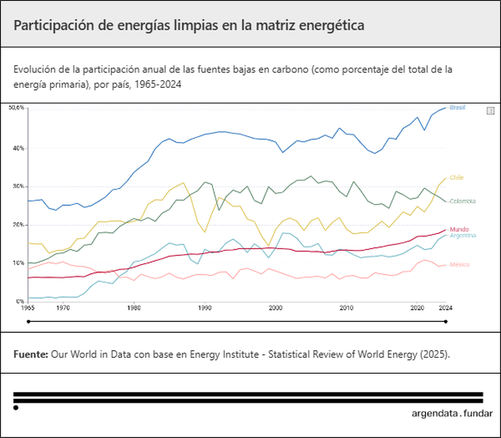 Aunque la participación de energías limpias en la matriz eléctrica argentina es de 38,9%, muy similar a la media mundial (39,3%), está lejos del promedio sudamericano (76,5%). Entre las fuentes limpias para generación eléctrica, la hidroeléctrica es la principal (16,5%), seguida por eólica (11%), nuclear (7,1%), solar (2,7%) y bioenergía (1,6%).
