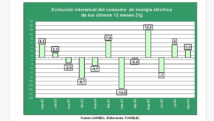 En agosto de 2024 la demanda neta total del Mercado Eléctrico Mayorista (MEM) fue de 12.171,4 GWh. El año anterior había sido de 11.756,02 GWh, lo que revela un ascenso de 3,5% en la comparación interanual evidencia.