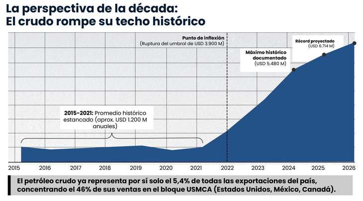 Los datos de RICSA confirman que el petróleo crudo ya no es un actor secundario en la economía nacional. Para febrero de 2026, el crudo por sí solo representaba el 5,4% de todas las exportaciones del país. Además, la estrategia comercial se ha volcado fuertemente hacia mercados de alta exigencia, concentrando el 46% de sus ventas en el bloque USMCA (Estados Unidos, México y Canadá).
