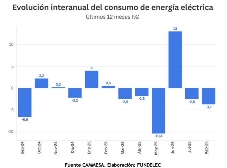 Respecto de julio de 2025, se observó un fuerte derrumbe del 9,2%, aunque desde la Fundación aclararon que dicha comparación "debe leerse con cautela, ya que puede estar influida por estacionalidades propias del sistema eléctrico o por eventos puntuales: por ejemplo, olas de calor o de frío, feriados largos, o modificaciones en los perfiles de consumo".