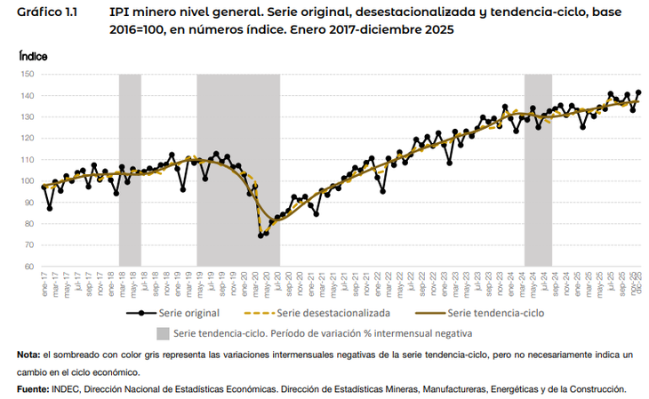 La producción de minerales e hidrocarburos arrojó un crecimiento acumulado del 3,3% durante 2025, en cantidades. El incremento fue explicado fundamentalmente por la performance del petróleo.