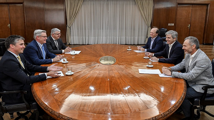 En paralelo a las definiciones del Presidente sobre el nuevo marco legal para las zonas glaciares y periglaciares, el ministro de Economía, Luis Caputo, mantuvo una reunión “muy productiva” con el nuevo CEO de Vicuña Corp., Ron Hochstein, el gerente general de la empresa, Dave Dicaire, y el Country Director de Argentina y Chile, José Morea.