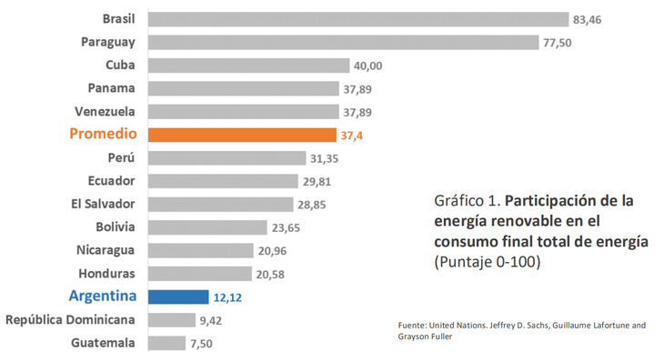 Proporción de energía renovable utizada en relación con el consumo total de energía final en una región o país (Argentina se ubica en el puesto 13 en Latam). “Esto se debe a que el país observa déficits de infraestructura importantes en ese sentido, con poca capacidad de generación y falta de tecnología para la transmisión y el almacenamiento”, explica Murcia.