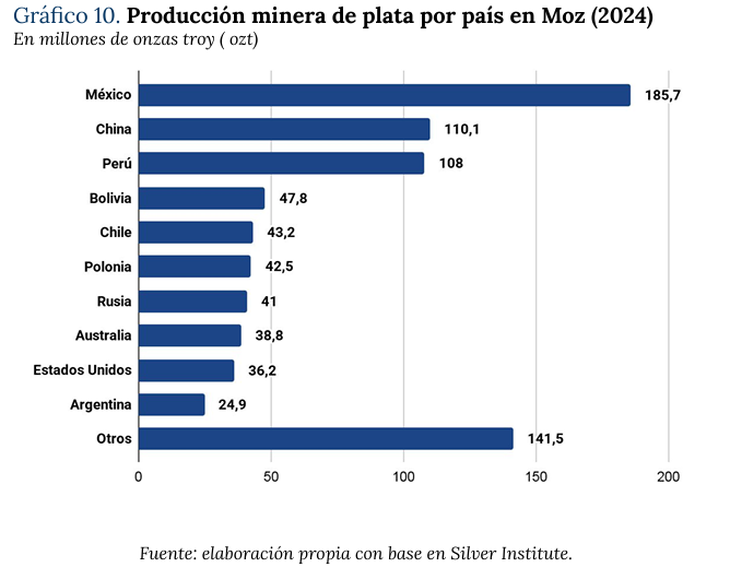 Las reservas mundiales de plata alcanzaron en 2024 unas 20.576 millones de onzas, con un crecimiento interanual cercano al 5%, según estimaciones del Servicio Geológico de Estados Unidos citadas en el informe. Sin embargo, el dato más relevante no es el volumen, sino su concentración geográfica.