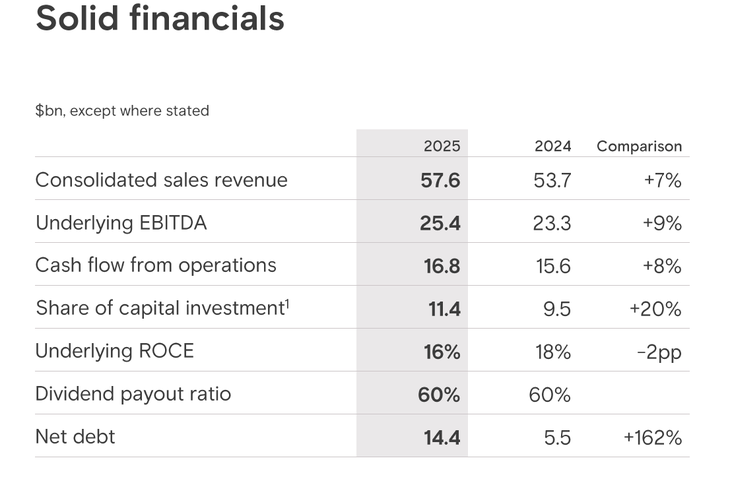 El desempeño operativo se reflejó en un EBITDA subyacente de u$s25.363 millones (+9%) y un flujo de caja operativo de u$s16.832 millones (+8%), cifras que evidencian la capacidad del grupo para sostener márgenes en distintos escenarios de precios.
