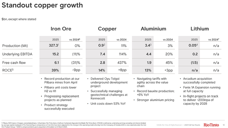 Rio Tinto presentó resultados 2025: ingresos por u$s57.638 millones y foco en cobre y litio para 2026